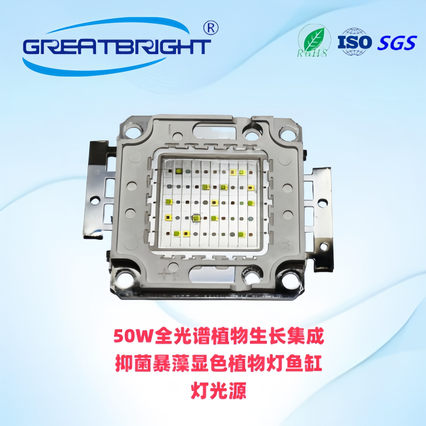 说明:50W全光谱植物生长集成光源,主要用于大棚或室内植物生长补光,加快植物生长,